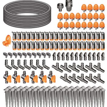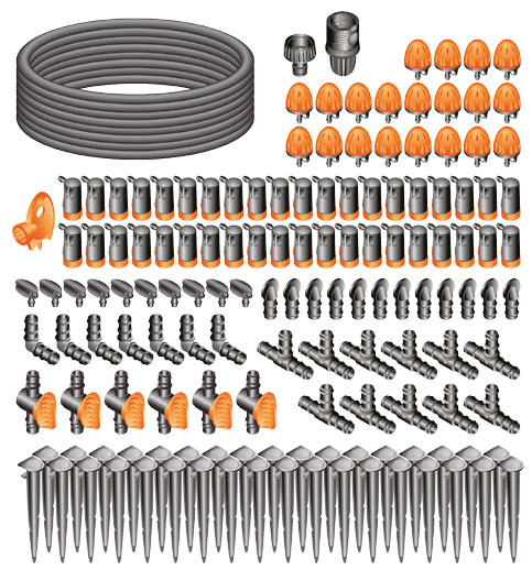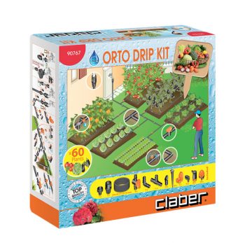 Ele contém os acessórios completos para a realização de 6 áreas de irrigação, para irrigar até 60 plantas com gotejadores ajustáveis ​​(final de linha 40 e 20 aspersores) e 25 m de tubo colector.